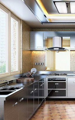 生产不锈钢整体橱柜时,要考虑电器、环境等因素。一起使用的抽油烟机、微波炉、烤箱,无论颜色、大小、风格,都与橱柜相搭配、相匹配。