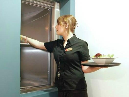 2 上行下行同时进行,循环传菜,一台抵六台传统的厢式传菜电梯。